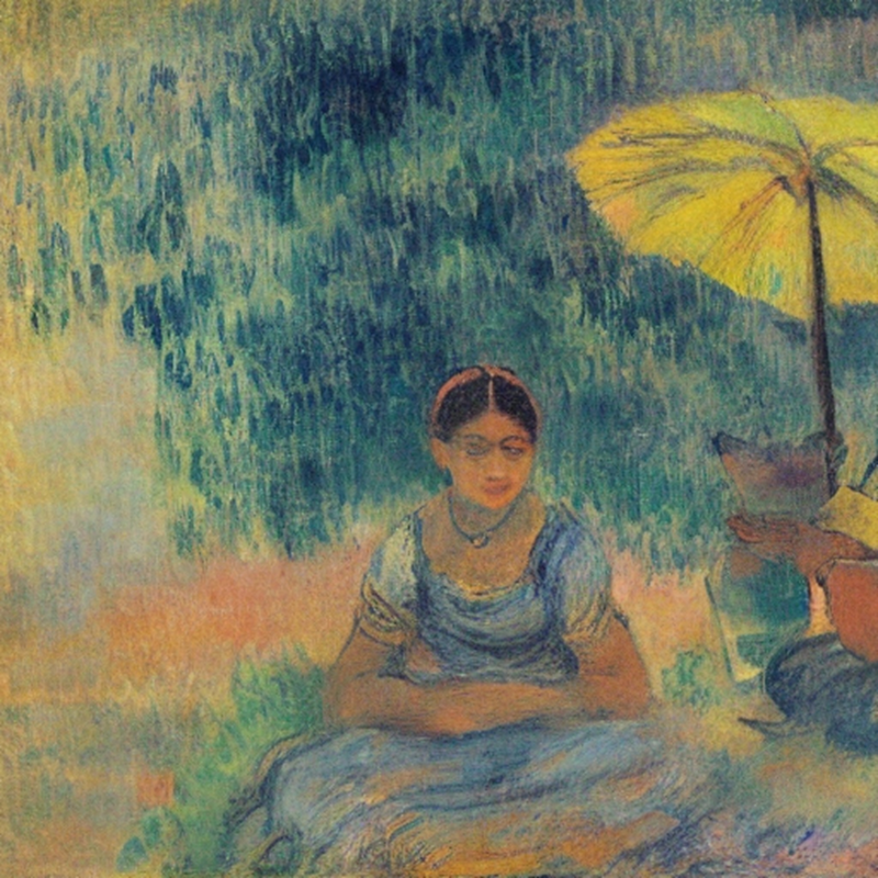 What did AI come up with when creating a book cover with the prompt South Asian women book cover? An Asian women sitting with her arms crossed in what looks like monsoon rain *sigh* (created using DeepAI, with keyword South Asian women book cover and selecting Impressionism)