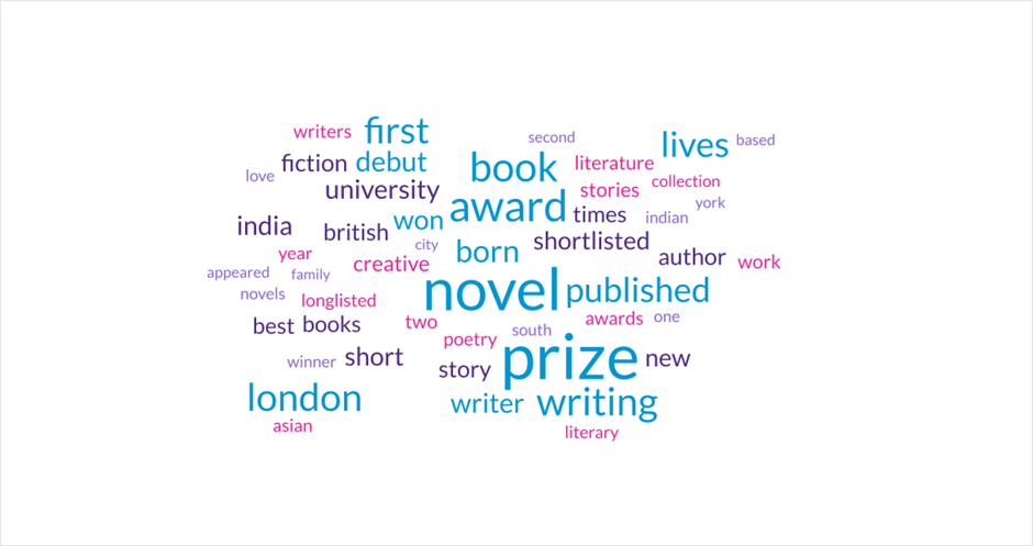 Author bios are grounded in place and commonly include words that represent where the author lives (India, Indian, city, London, York, lives, based, British, Asian, South, city).